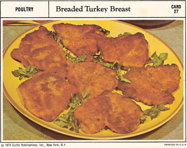 Preheat oven to 325°. Cut turkey breasts in serving size pieces. Beat egg and water. Dip turkey in beated egg and roll in mixture of bread crumbs, salt, pepper, oregano and rosemary. Brown lightly in butter. Place in baking pan, drizzle with wine and lemon juice. Bake for 1 hour or unti tender.