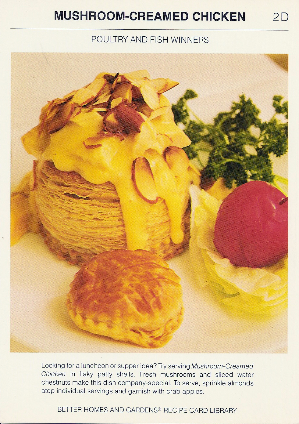 Cook chopped celery and onion in butter. Add mushrooms; cook 1 to 2 minutes. Blend in flour. Add reserved stock and light crea; cook and stir till bubbly. Add chicken, sliced water chestnuts, sherry, parsley, 1/4 teaspoon salt, and white pepper. Cook 2 minutes. Serve in patty shells. Top with toasted almonds.