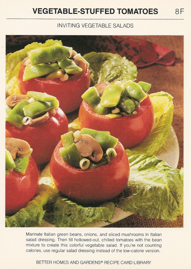 Meanwhile, cut thin slice from top of each tomato. Using a small spoon, scoop out centers, leaving shells about 1/4 inch thick. (Use tomato centers in sauce or salad another time.) Invert shells on paper towelling to drain; chill. At serving time, sprinkle insides of tomato shells with salt; spoon in bean mixture. Serve salads on romaine leaves, if desired. Makes 6 servings.