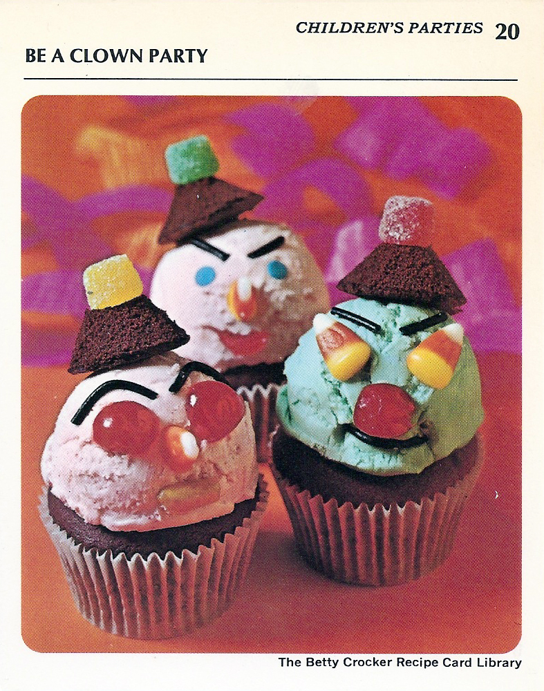 I love how the clown cupcakes have angry faces. That’s a little odd but so funny. I found your blog on foodpress – what a great idea. I think my great-aunt had some of these recipe cards at one point – I should have snagged them 🙂