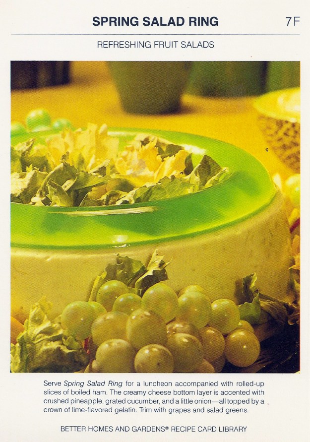 Dissolve lime-flavored gelatine in the 1 3/4 cups boiling water; stir in the lemon juice. For clear gelatin layer, measure 3/4 cup of the gelatine mixture and to it add the 1/4 cup water; pour into a 6-cup ring mold. Chill till almost set.