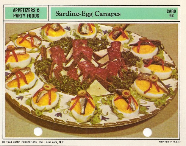 Cut egg in half lengthwise. Carefully scoop out yolks and mash; mix with salt, pepper, mayonnaise, mustard and horseradish. Fill whites with yolk mixture and top each with a sardine, pimento and olive slices. Arrange eggs around a large round platter. In the center of the platter, alternate pumpernickel slices, Swiss cheese and salami. Garnish with parsley.