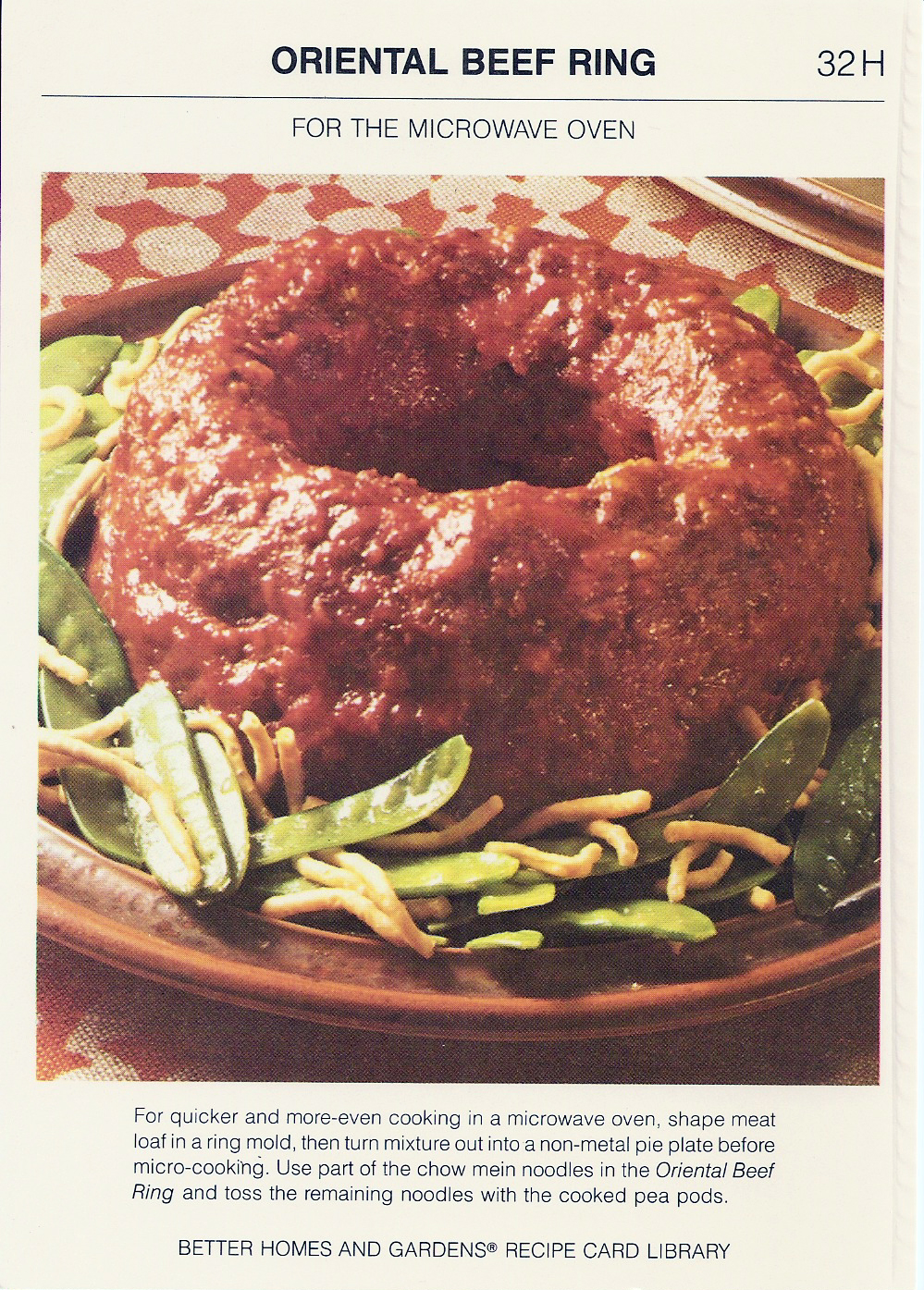 Finely crush 1 cup of the noodles; combine with 2/3 cup of the tomato sauce. Let stand 5 minutes to soften. In large bowl combine egg, celery, the 2 tablespoons soy sauce, ginger, and noodle mixture. Add beef; mix well. Press into an oiled 3-cup ring mold (6 1/2 inches in diameter and 2 1/2 inches deep). Loosen edges. Invert mold into a 9-inch non-metal pie plate. Remove mold. Cook, covered with waxed paper, in countertop microwave oven on high power about 10 minutes or till done, turning dish every 3 minutes. Drain off excess fat. Combine remaining tomato sauce, sugar, and 2 teaspoons soy sauce; brush on meat ring. Micro-cook, uncovered, 30 seconds. Cover; keep meat ring hot.
