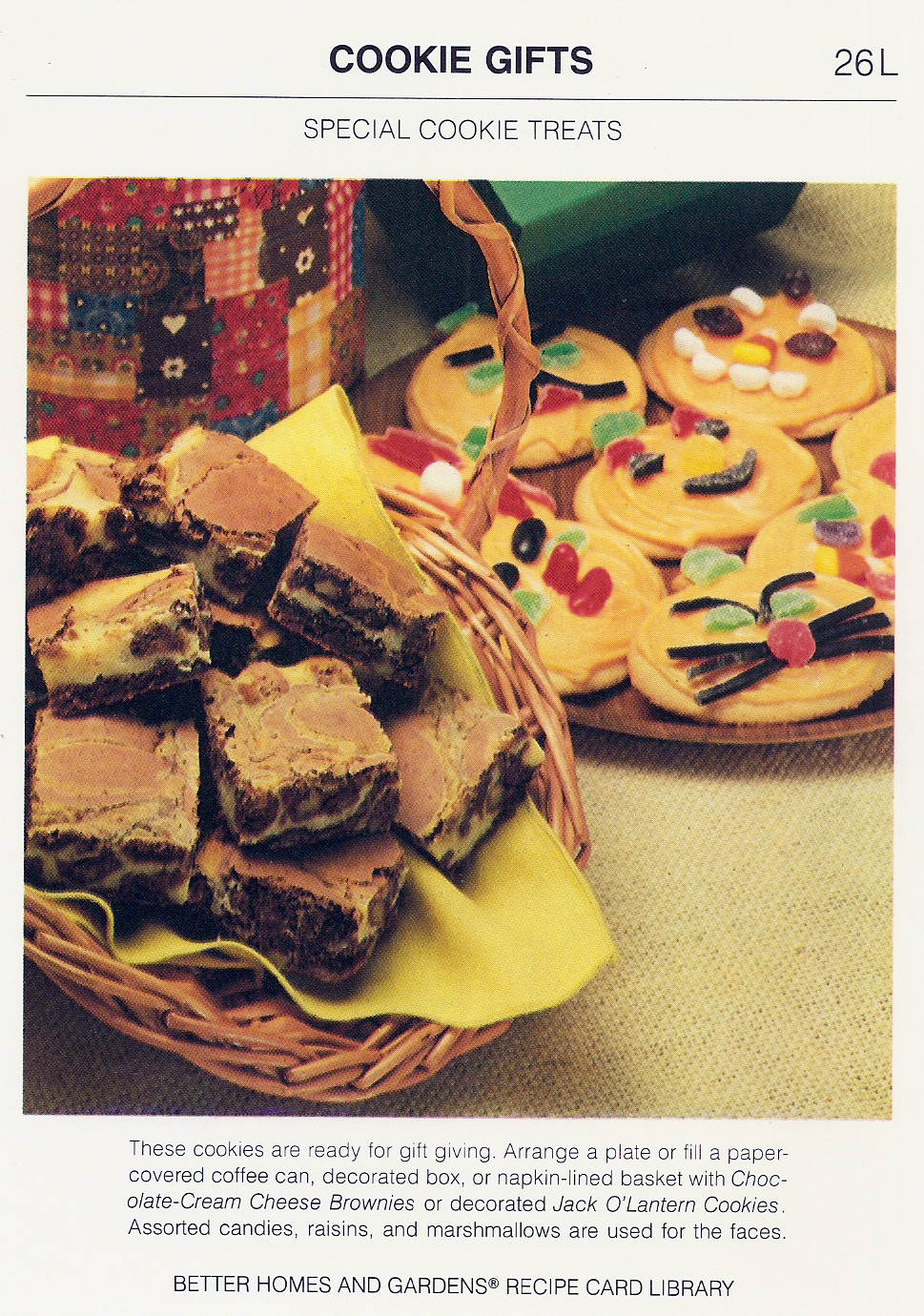 To make frosting, add enough light cream or milk (about 4 to 5 tablespoons) to 4 cups sifted powdered sugar in a bowl to make of spreading consistency. Stir in 1 teaspoon vanilla, 12 drops yellow food coloring, 4 drops red food coloring, and dash salt. Spread frosting on cooled cookies. Decorate faces with raisins, gumdrops, jelly beans, candy corn, and tiny marshmallows. Makes 5 1/2 dozen cookies.