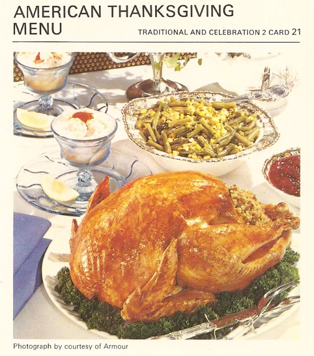 Mix 4 cups fresh soft bread crumbs from a brown or wholewheat loaf with 8 stalks finely chopped celery, 1/4 cup chopped parsley, 1 teaspoon chopped lemon thyme, grated rind and juice of 1 lemon, 1 finely chopped onion, 1 cup shredded suet or melted margarine and 2 eggs or 3 egg yolks. Put into an 8-10lb turkey; either cook in a 325-350°F oven allowing 30 minutes per lb and 30 minutes over or in a 425-450°F oven allowing 15 minutes per lb. and 15 minutes over. Baste well with melted fat or butter unless using the special self basting turkey (Illustrated). ALWAYS ALLOW FROZEN TURKEYS TO DEFROST BEFORE COOKING. Serve with roast potatoes, corn and beans and cranberry and applesauce.
