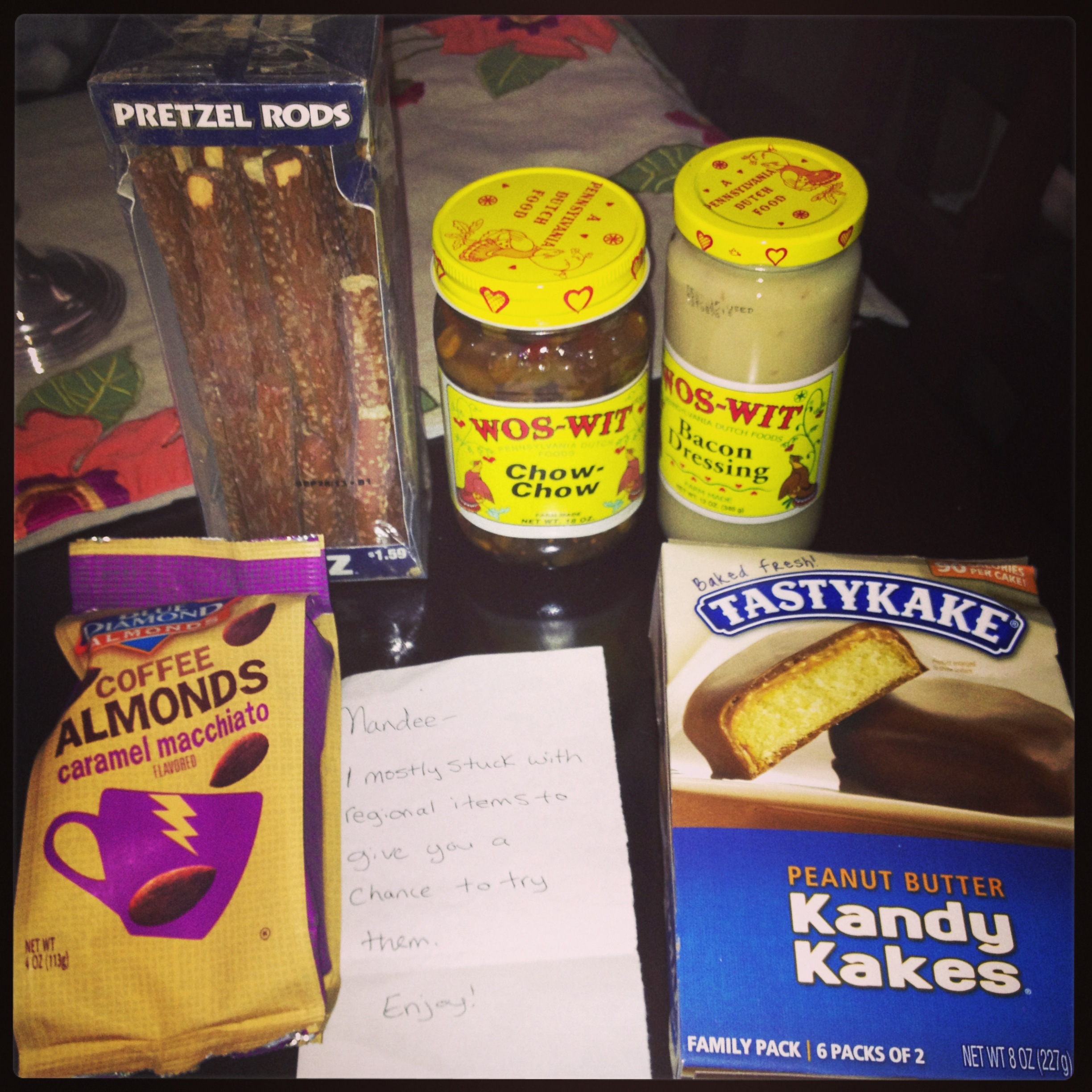 When I got home from my trip I got this fab package from my new friend Becca from Pennsylvania. She sent me all kinds of fun local products. My husband immediately grabbed the TastyKakes and hoarded them for himself. He grew up on the East Coast and these made him feel homesick. I on the other hand grabbed the pretzel rods. She couldn’t have known but I’m a huge salt whore and love to sit and suck all the salt off of pretzels. I also immediately Instagrammed the picture of the Bacon Dressing to make my friend Jodi (who is the Queen of All Things Bacon) jealous.