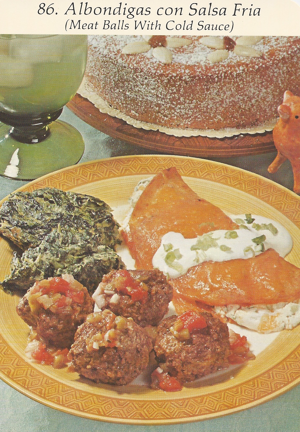 Soak bread in hot milk, drain well, add with egg to meat. Season with cloves, cinnamon, salt and pepper. Mix thoroughly. Form into balls about the size of a large walnut. If desired, hid an olive in the center of each. Combine broth with water and chili powder, bring to boil, add meat balls and simmer 30 min., or bake at 350@deg; F, for 40 min. Serve with Salsa Fria. Makes 6 servings: