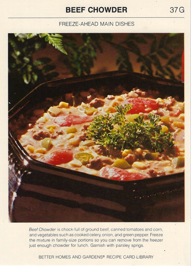 Advance preparation: Cook beef, celery, onion, and green pepper till meat is browned; drain. Add condensed soup, undrained tomatoes and corn, the parsley and salt. Simmer, covered, 30 minutes. Cool quickly. Pour into freezer containers. Seal, label, and freeze.