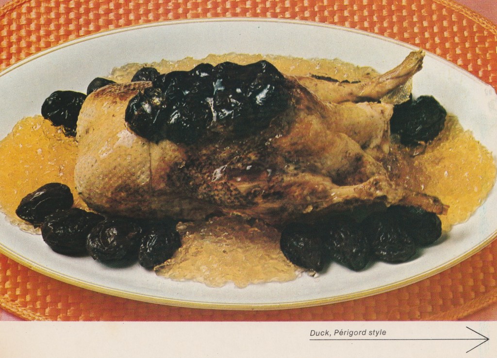 7. Place the stuffed prunes around the duck, together with any leftover gelatine. Serve cold, with a green salad in season.