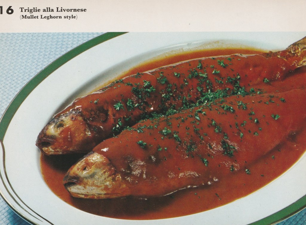 Chop the onion and tomatoes and slice the celery. Heat the olive oil in a saucepan and fry the chopped onion, garlic cloves, sliced celery and parsley for several minutes. When they begin to soften and colour add the chopped tomatoes and salt and pepper. Cover the pan and simmer very gently until pulped, about 30 minutes. Press through a sieve into a shallow flameproof dish and check the seasoning. The sauce should be rather thin so if necessary stir in a little water. Arrange the mullet, previously washed and dried, head to tail in the auce. Cook over low heat until tender, about 20 minutes, basting with sauce frequently. serve hot, in the same dish, sprinkled with freshly chopped parsley.