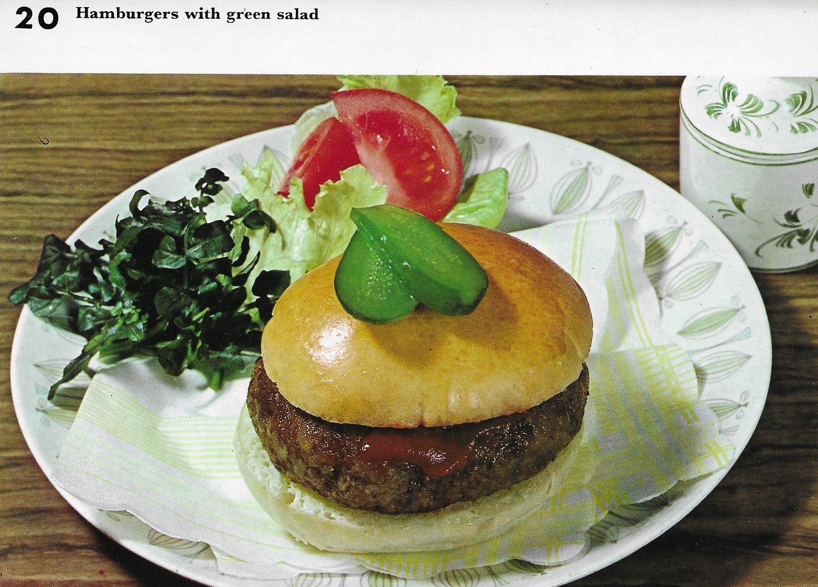 You will need 1 lb. minced beef 1 large or 2 medium-sized onions seasonings ½ teaspoon mixed herbs 1 heaped teaspoon chopped parsley 1 teaspoon Worcestershire sauce 1 potato flour toasted breadcrumbs hamburger buns tomato lettuce watercress