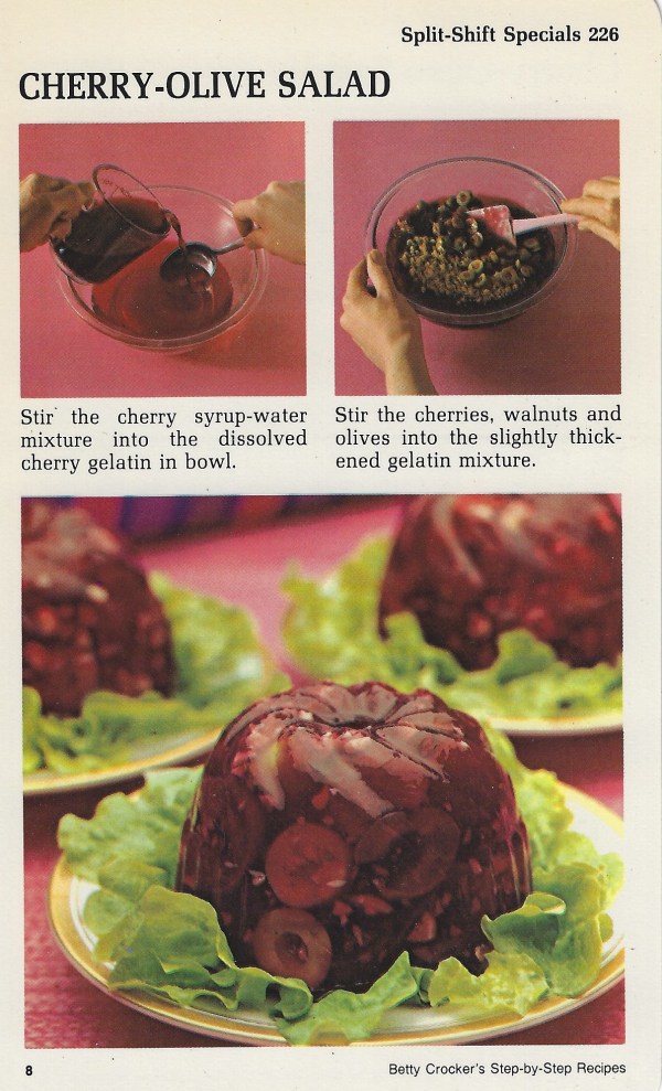 Stir cherries, walnuts and olives into gelatin mixture. Pour into 6 individual molds. Refrigerate until firm, about 3 hours. 6 SERVINGS.