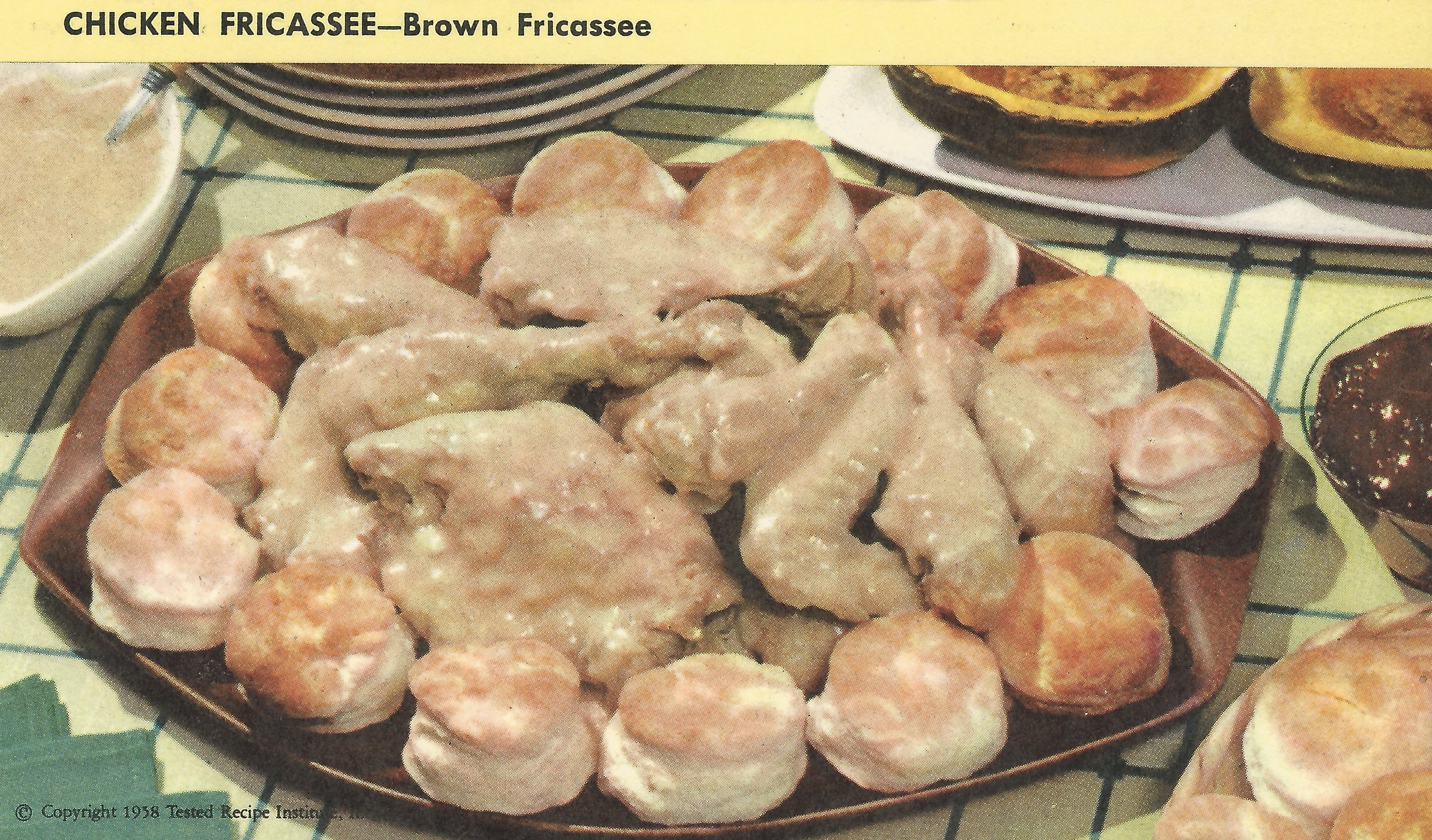 BROWN FRICASSEE OF CHICKEN: Buy a 4 to 5-pound ready-to-cook stewing chicken; have it cut up. Combine 1/2 cup flour, 1 tsp. salt and dash pepper. Dredge chicken pieces in the flour mixture; coat well. Fry the chicken over low heat in 1/4 cup fat or cooking oil until brown on all sides. Continue as directed, above, adding water, onion, etc. to sauce pot in which chicken was browned.