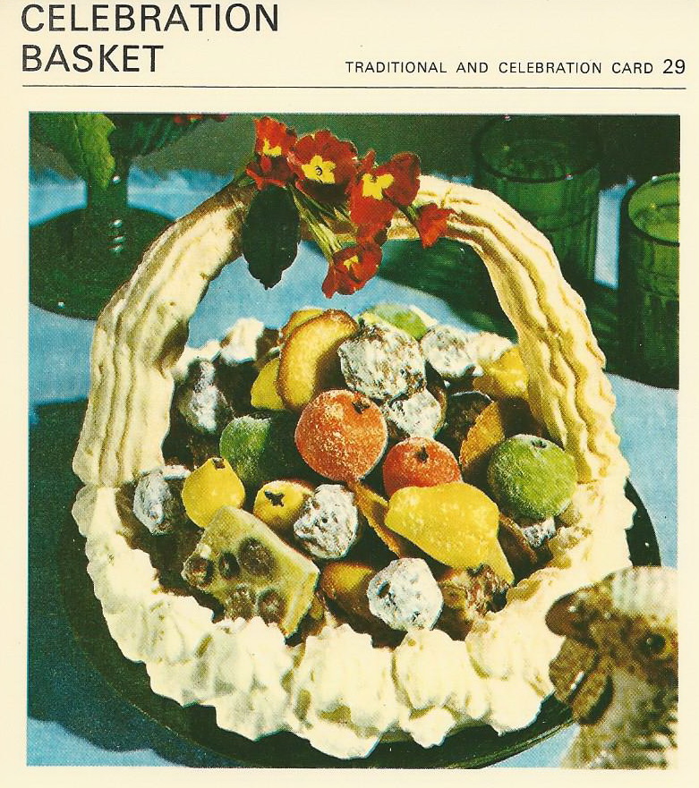 TO SERVE: Stick the handles together and to the sides of the basket with a little cream. Fill basket with almond paste fruits, hazelnut fudge,brandy pennies and chocolate truffles.