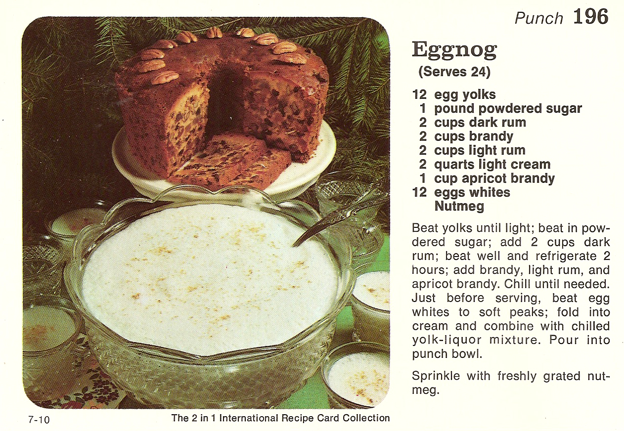 Beat egg yolks until thick. Slowly add and beat in brandy and rum. Stir in milk. Whip egg whites until very foamy. Gradually add and beat in sugar; beat just until egg whites form soft, shiny peaks. Fold egg whites into brandy mixture; fold in cream. Chill. Serve in a chilled bowl; sprinkle with nutmeg. Makes about 24 servings.