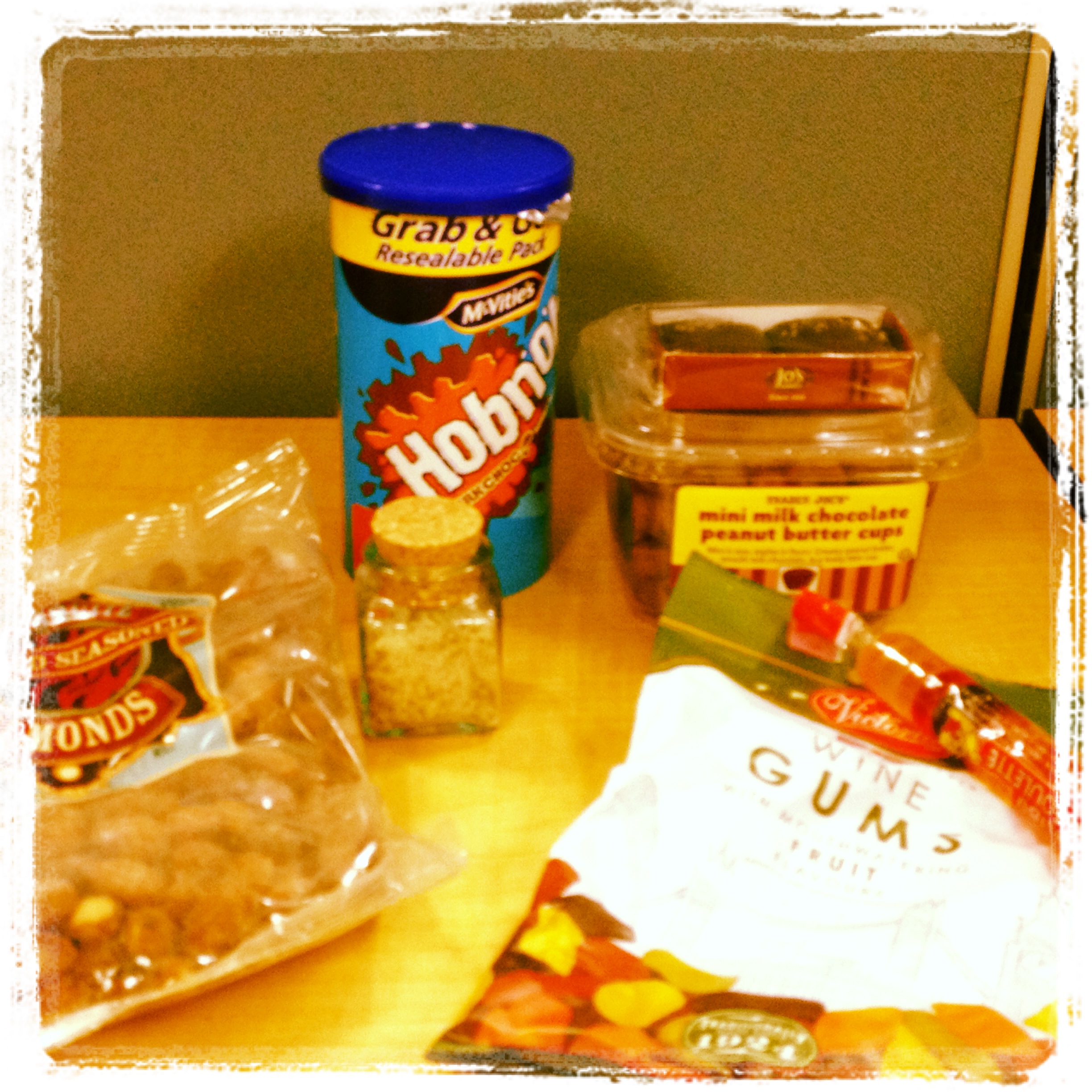 I decided to go with a few core favourites: Sea Salt Caramels, Mesquite Smoked Seasoned Almonds (addicting like crack), Hob Nob Biscuits which I became addicted to at university in London. For her son, I decided to share with him my weird taste in candy. Wait? What? You’re surprised I have weird taste? Where have you been? I like candy that I have to work at chewing. I really, really love stale Red Vines, but I thought that might be a little weirder than total strangers might be willing to work with, so I went with Wine Gums and Haribo Mega Roulettes. They are both gummy candies that I also discovered at university. They not quite as tough on your dental work as Jujubes, but they aren’t nearly as soft as gummy bears. They do a nice job of getting stuck in your teeth, and if you eat the whole bag in one sitting your jaw muscles will hurt. It’s really kinda awesome when your jaw is so tired from shoving a lot of chewy candy in your mouth. You know it is.