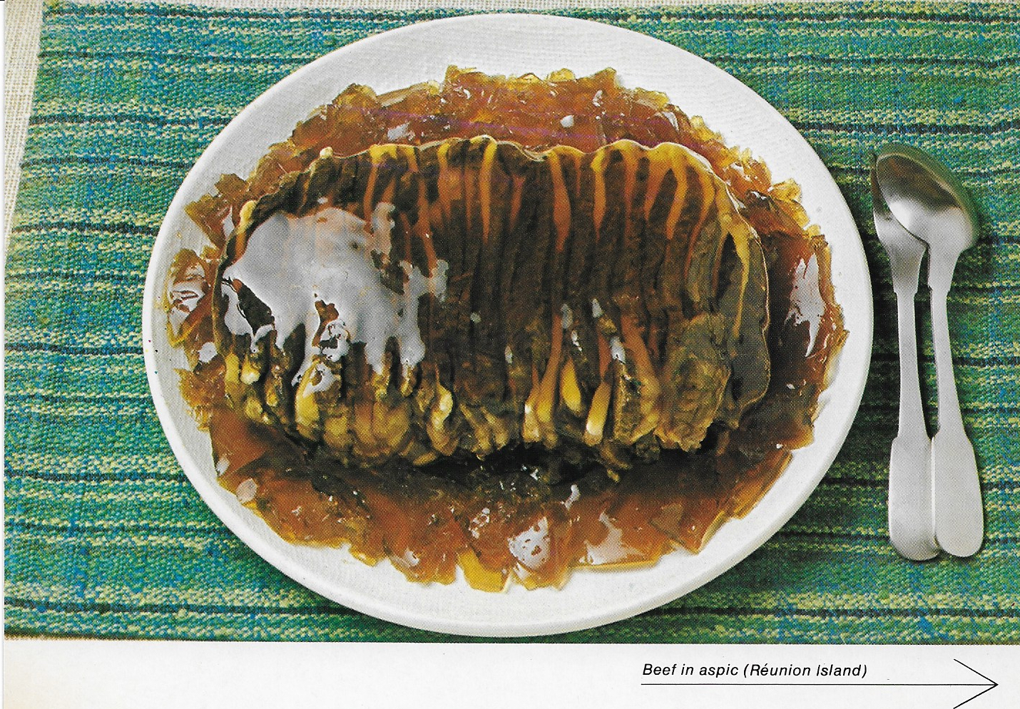 ingredients: 2 pounds thinly sliced lean beef (from the rump or round) ¼ pound lean bacon strips 2 onions 2 shallots 2 cloves garlic 1 handful parsley 1 sprig thyme, or ½ teaspoon dried 1 bay leaf salt, pepper nutmeg 4 ounces fresh bacon fat 1 Tablespoon flour 2 cups dry white wine 1 calf’s foot 1 teaspoon agar-agar or Japanese Moss 1 cup beef bouillon