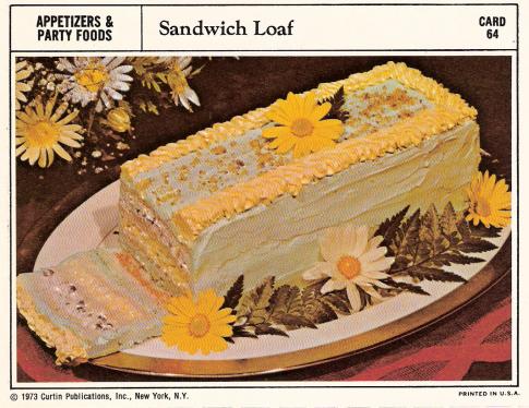 To finish: frost top and sides of loaf with green-tinted cheese; make a decorative border of yellow cheese. Garnish with fresh flower or use other garniture – radish roses, carrot curls and stuffed olives.