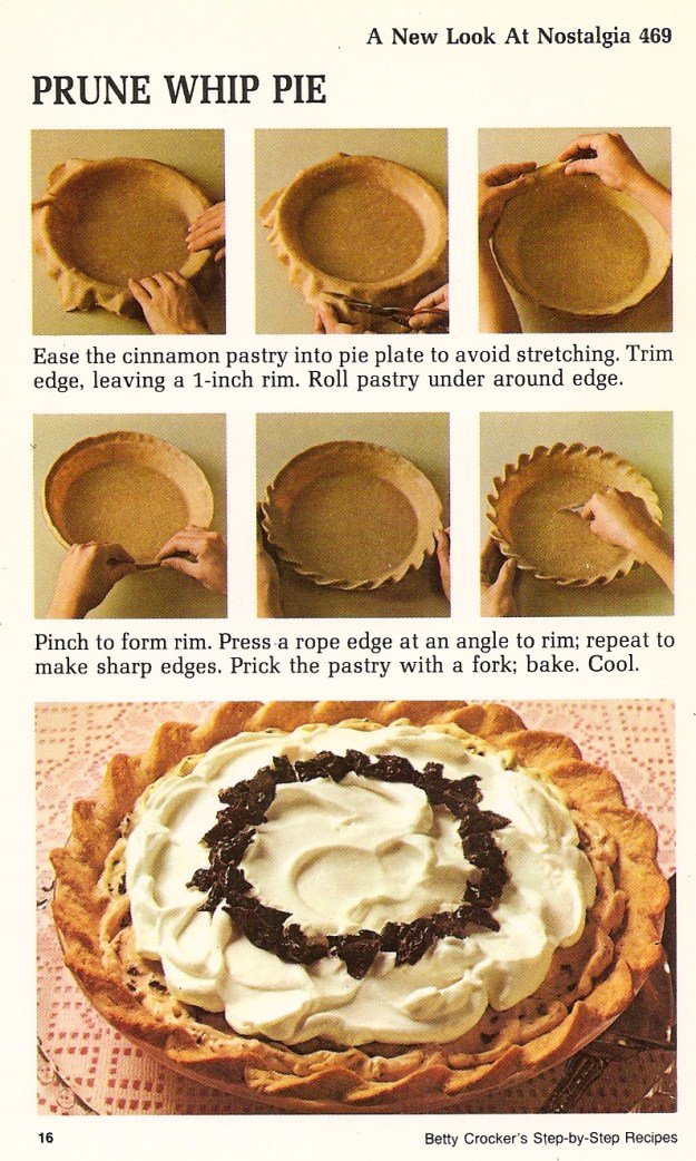 I know, it’s weird. I don’t normally write posts on this blog. I just fill your inbox and Facebook feed with horrors from your childhood and long lost favorite dishes that should stay lost. But every so often an opportunity comes along that cannot be missed. Case in point, Yinzerella‘s Pieathalon challenge. She asked a group of retro food bloggers to submit pie recipes from a bygone era, then she randomly drew out and assigned pies to each of us. Our challenge was to whip up the pie and post about it. I’ll confess that I was a bit mean spirited in my submission as I sent in Prune Whip Pie. I’m pretty sure the blogger who got my recipe was horrified to discover such a thing existed.
