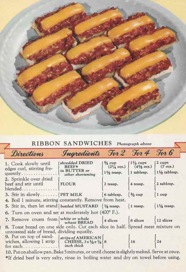 Ribbon Sandwiches 2 Replies Mary Lee Taylor’s Meals that please for 2 or 4 or 6 – Copyright 1941, Pet Milk Company, St. Louis, Mo. Form No. 3750 Share this: Click to share on Facebook (Opens in new window) Facebook Click to share on X (Opens in new window) X Click to share on Reddit (Opens in new window) Reddit Click to email a link to a friend (Opens in new window) Email Like Loading...