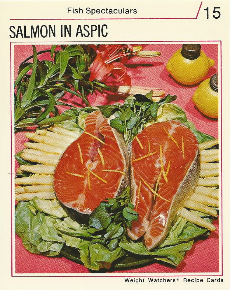 Decorate salmon as desired with cucumber peel, tomato, white of egg, and hard-boiled egg yolks or radishes, and chill in refrigerator before covering with liquid aspic. Serve with mayonnaise or Sauce Verte.