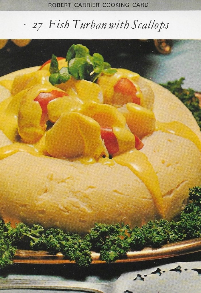 Poach fish in a well-flavored court-bouillon until flesh flakes easily with a fork; remove from court-bouillon and drain. Remove skin and bones, and flake fish. Bring milk to a boil; pour over fresh breadcrumbs and mix well with flaked fish; pound in a mortar until smooth. Add egg yolks and cream and mix well into mixture. Beat egg whites until stiff and fold gently into fish mixture. Season to taste with salt, freshly ground black pepper and a pinch of caynne. Spook mixture into a buttered ring mold; place mold in a pan of boiling water and bake in a slow oven (325° F.) for 1 hour, or until turban is firm. To serve: unmold turban onto a heated serving dish and fill ring with curried scallops, crab or shrimp, or more simply mussels in a lightly curried cream sauce. Serves 6 to 8.