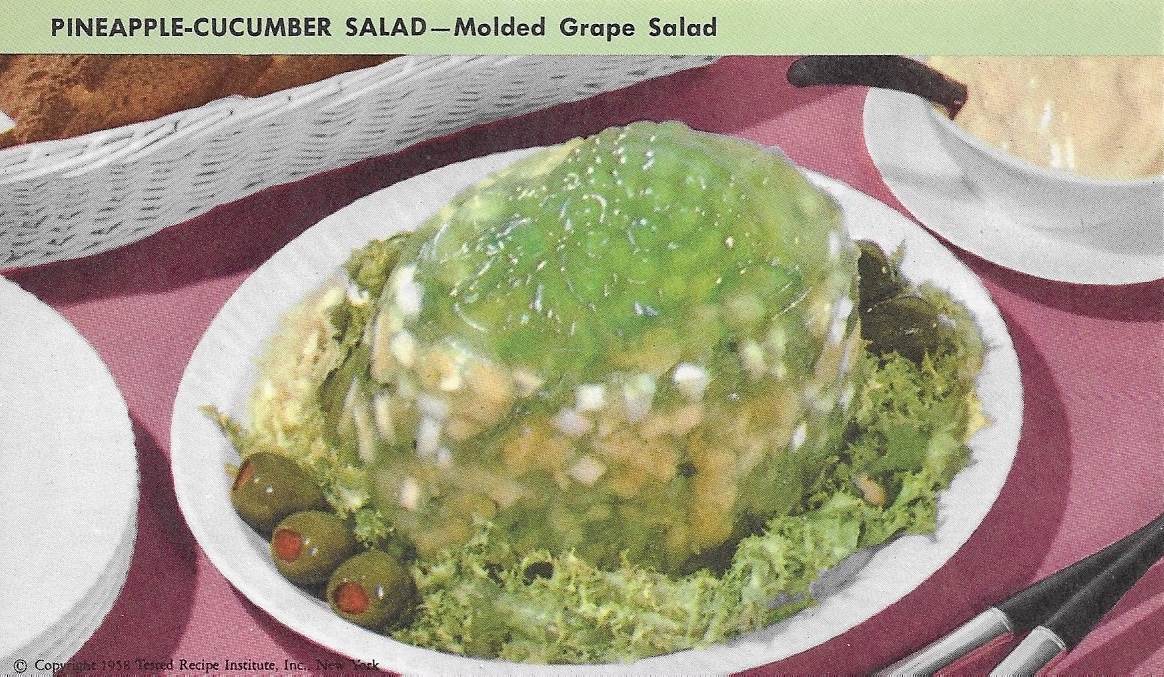 1 can (20 oz.) crushed pineapple Water 1 envel. unflavored gelatin ½ cup sugar 1 tsp. salt Juice of 1 lemon ⅓ cup vinegar Green food coloring, if desired ½ cup diced cucumber