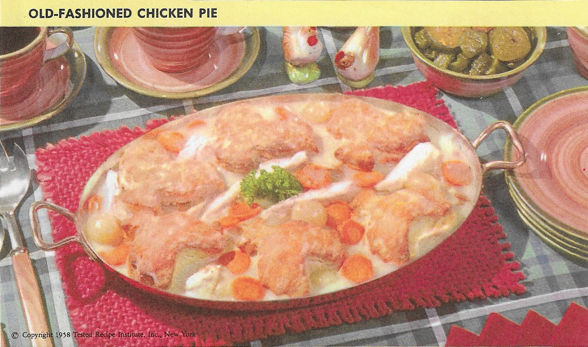 Skim fat from broth; measure ½ cup fat and 2⅓ cups broth. Heat the ½ cup fat in a large saucepan; blend in four. Slowly add and stir in the 2⅓ cups broth and the milk. Cook and stir until sauce thickens. Add chicken, carrots, and onions, and more salt and pepper to taste; reheat. Pour into a 3-quart baking dish. Prepare biscuit dough and cut with a cutter in any desired shape. Arrange the uncooked biscuits on top. Bake in very hot oven, 450°, 20 to 25 minutes, or until biscuits brown. Makes 6 to 8 servings.
