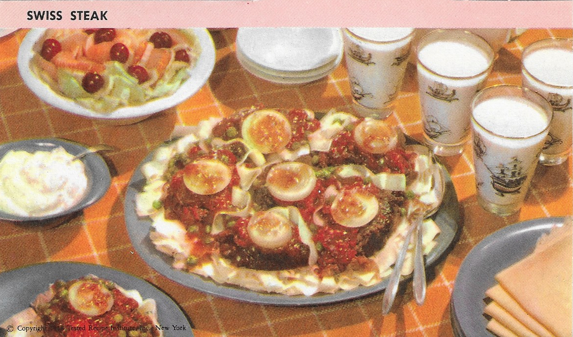 Melt fat in a large skillet over low heat. Put the meat into the skillet and brown it on both sides. Add the tomatoes; cover skillet and cook meat about 1 hour. Add the peas and place onion slices on top of meat. Continue to cook, covered, about ½ hour longer or until meat and onions are fork-tender. Serve on the hot cooked noodles with one or two slices of onion on top of each portion of meat. Pour pan drippings over all. Makes 6 to 8 servings.