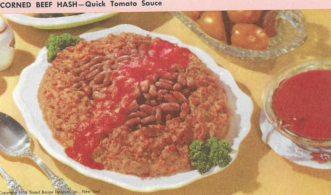 3 cups chopped cooked corned beef 3 cups chopped cooked potatoes ¼ cup chopped onion ½ cup milk Salt and pepper ¼ cup fat or cooking oil Quick Tomato Sauce, see below