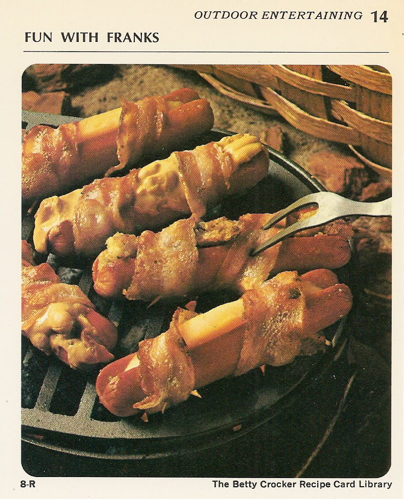 Wrap each frankfurter with bacon; secure with wooden picks. Place on grill 4 inches from medium coals. Cook 12 to 15 minutes, turning frequently.