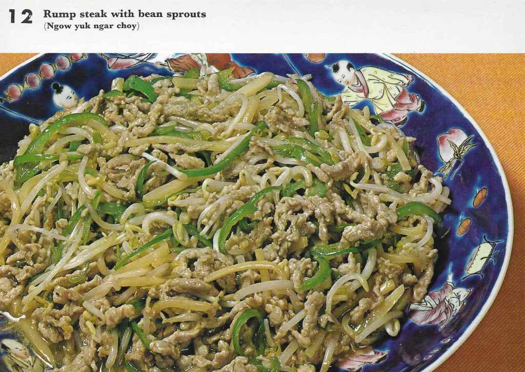 You will need 1 oz. bamboo shoots 1 green pepper 3-inch piece leek or spring onion 5 oz. beef (rump steak) salt ½ teaspoon monosodium glutamate white pepper 1 tablespoon sherry 1 egg white 1 teaspoon cornflour 4 oz. bean sprouts 4 tablespoons peanut oil 1 crushed clove garlic 1 tablespoon soy sauce ¼ teaspoon sugar