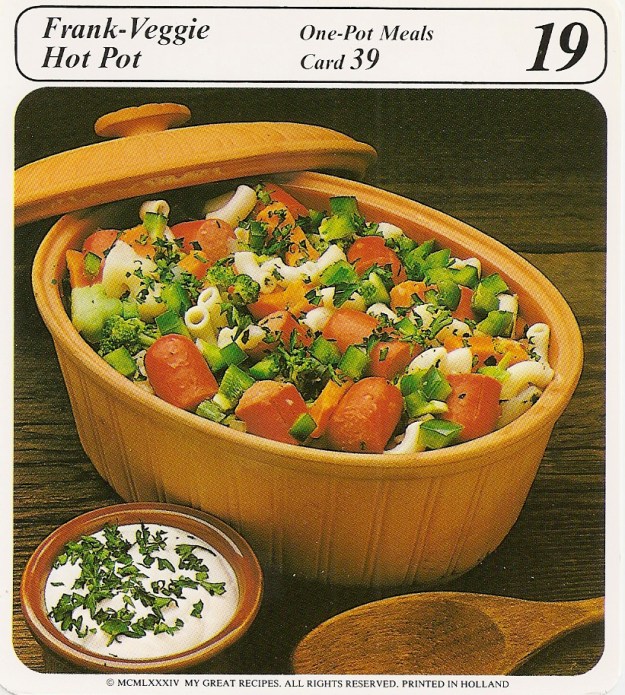 TO VARY: Use diced cooked ham or cooked chicken in place of frankfurters or add neatly diced uncooked white fish at stage 2 together with a few shelled prawns or shrimp at stage 5.